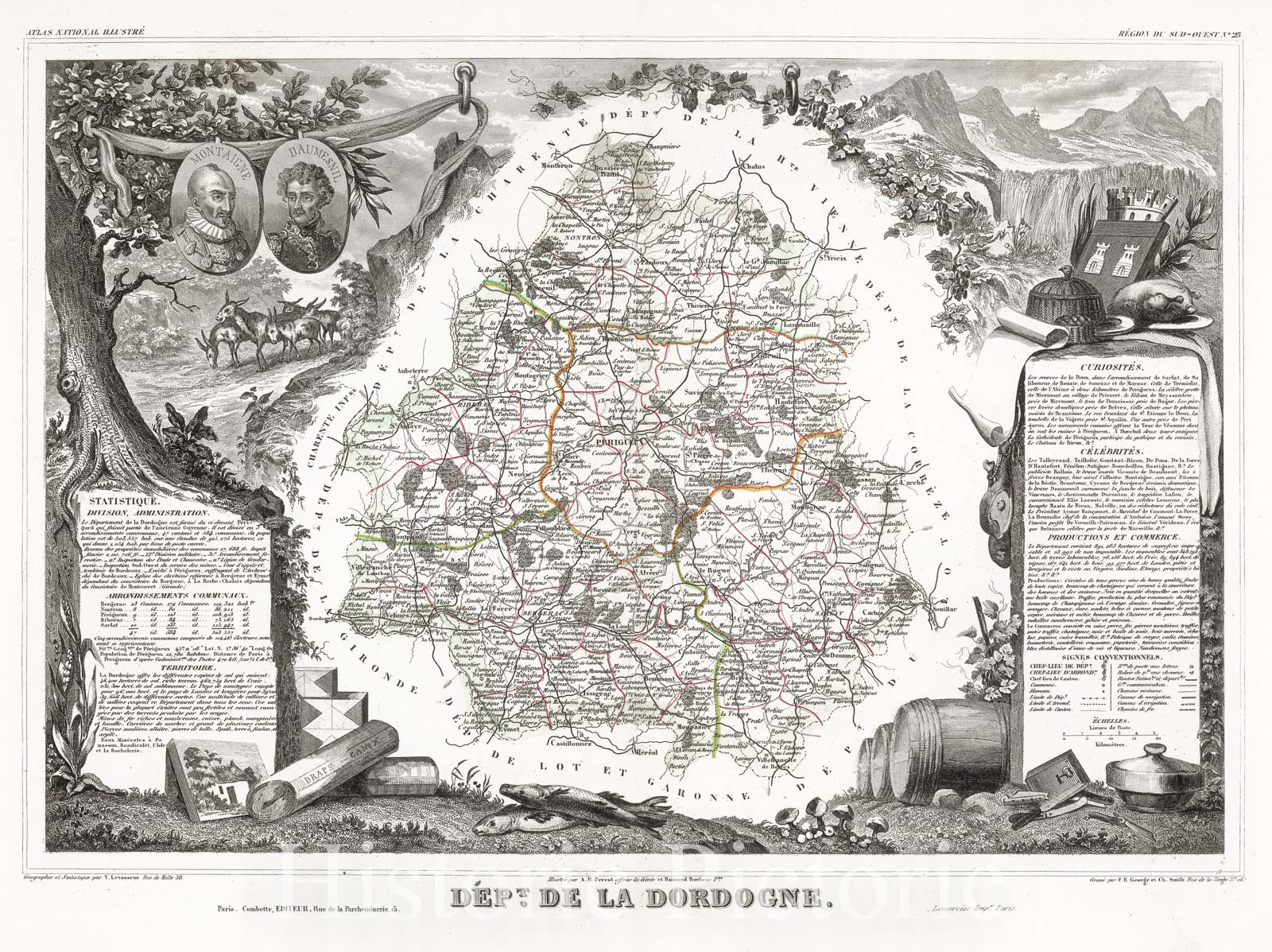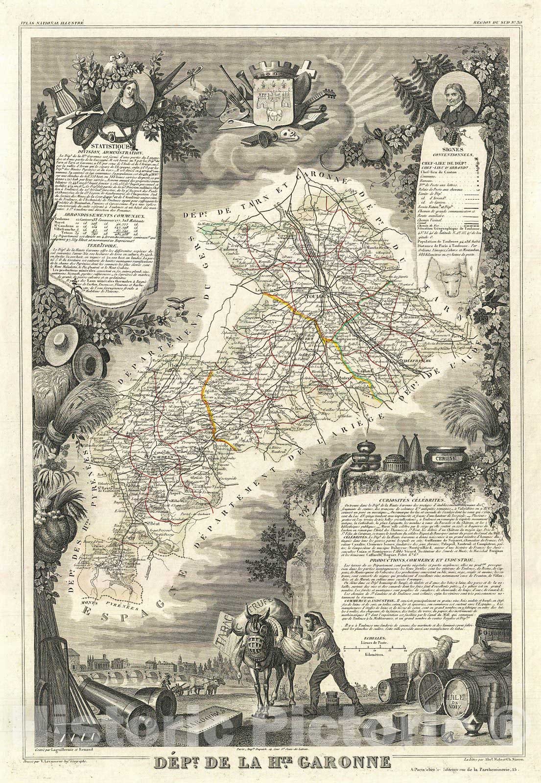 This is a fascinating 1852 map of the French department of Haute-Garonne, France. This area of France produces the delicious but lesser known Buzet wines, and tender Rocamadour cheeses. The whole is surrounded by elaborate decorative engravings designed to illustrate both the natural beauty and trade richness of the land. There is a short textual history of the regions depicted on both the left and right sides of the map. Published by V. Levasseur in the 1852 edition of his Atlas National de la France Illustrée.