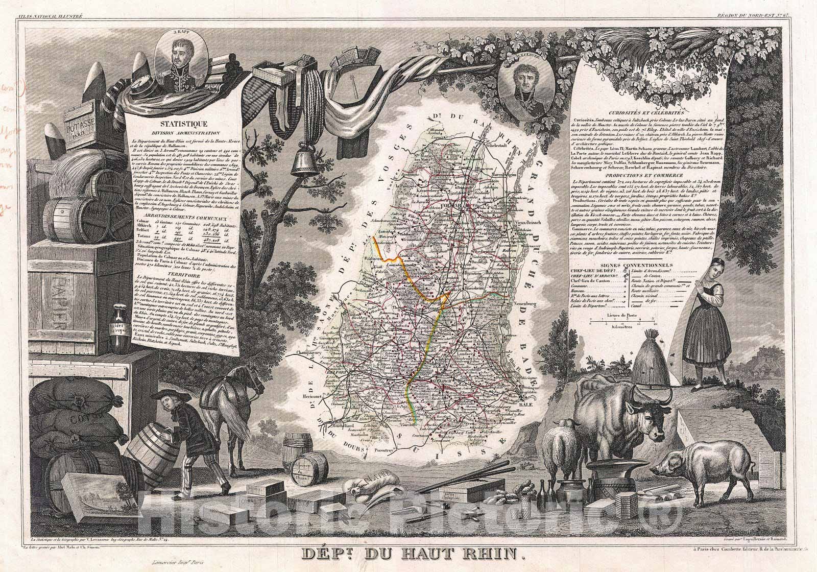 This is a fascinating 1852 map of the French department of Haut-Rhin, France. This mountainous area is part of the Alsace wine region and is known for its production of both Pinot Noir and Pinot Gris. The map proper is surrounded by elaborate decorative engravings designed to illustrate both the natural beauty and trade richness of the land. There is a short textual history of the regions depicted on both the left and right sides of the map. Published by V. Levasseur in the 1852 edition of his Atlas National de la France Illustree.
