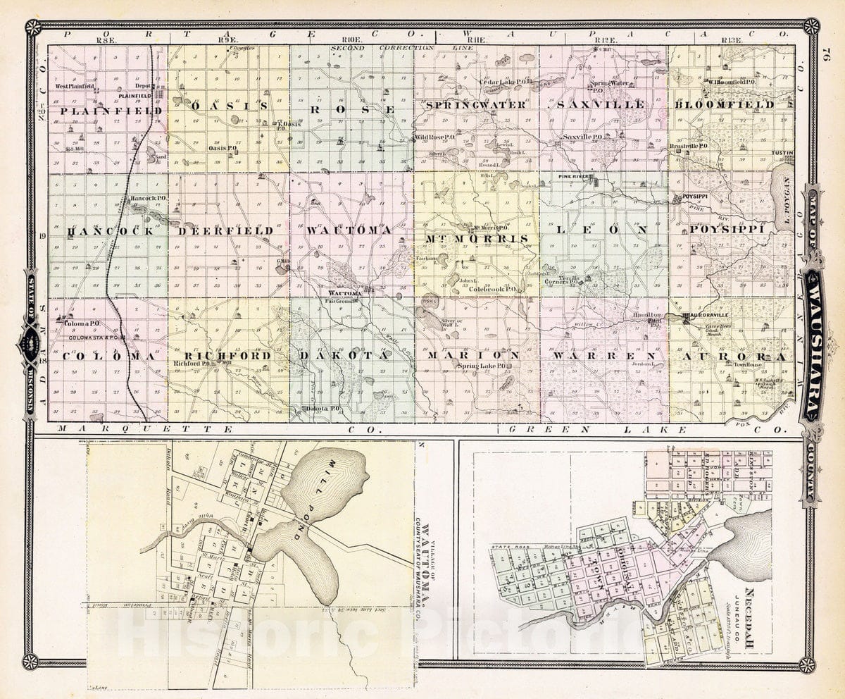 Historic Map : 1878 Map of Waushara County, Necedah and Wautoma, State of Wisconsin. - Vintage Wall Art