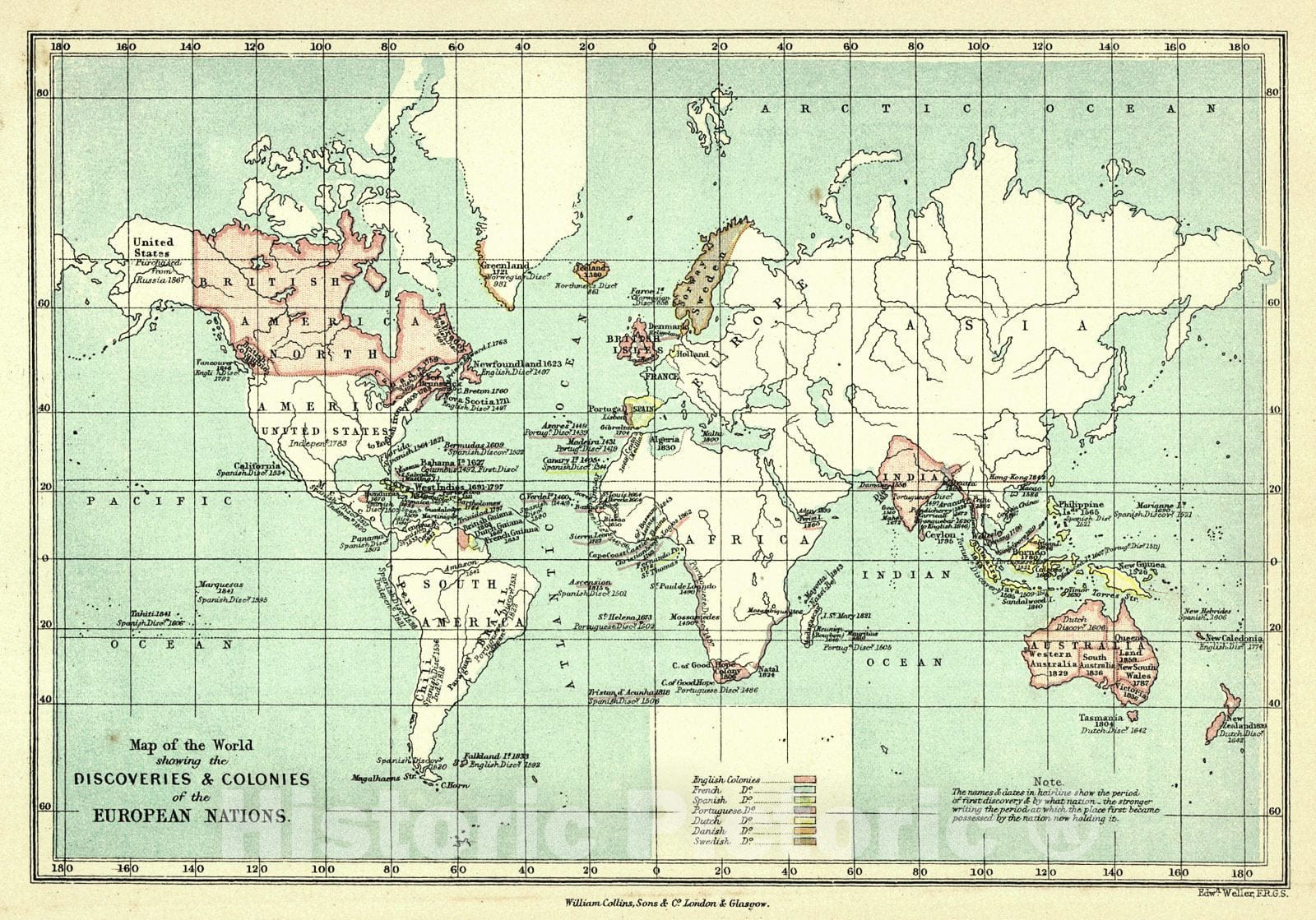 Historic Map : 1872 Map of the World showing the Discoveries and Colonies of the European Nations : Vintage Wall Art