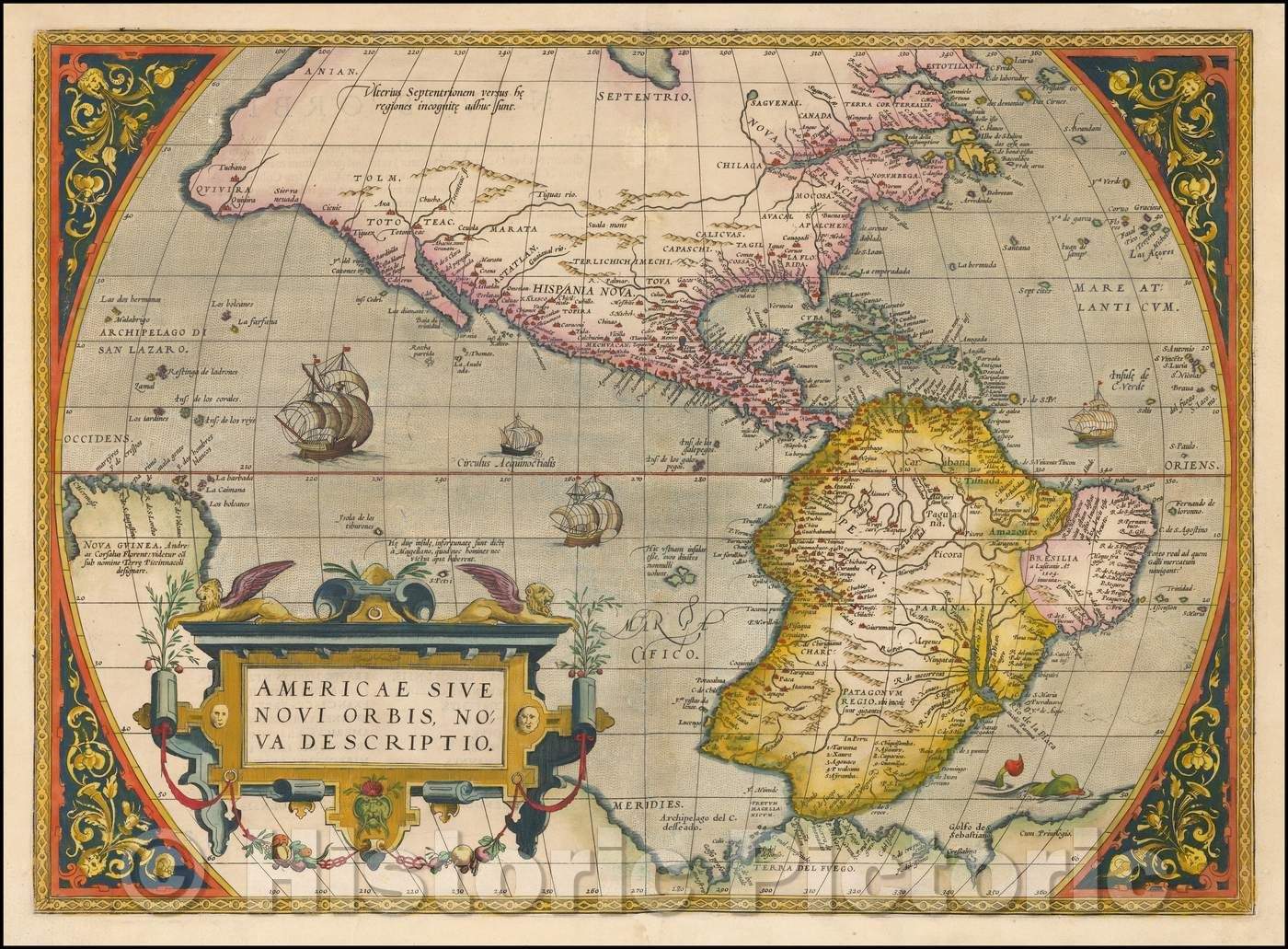 • .Historic Map - Americae Sive Novi Orbis Nova Descriptio/America World Map, 1571, Abraham Ortelius - Vintage Wall Art