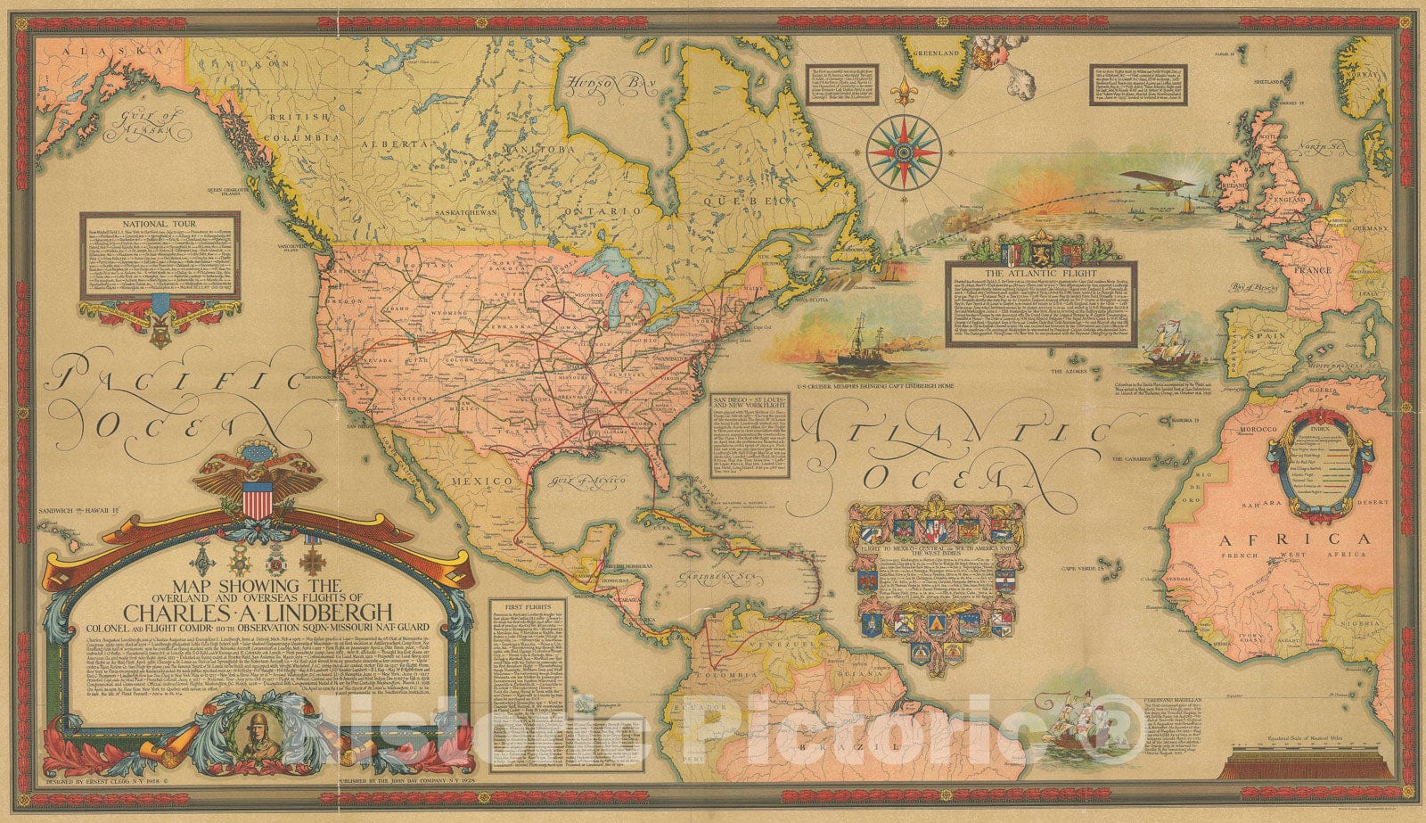 Historic Map : Clegg Pictorial Map of The World Tracing The Flights of Charles Lindbergh, 1928, Vintage Wall Art