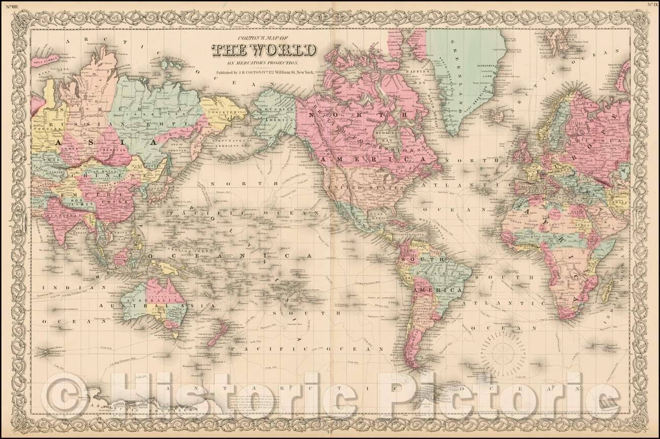 • .Historic Map - Colton's Map of the World on Mercator's Projection, 1855, Joseph Hutchins Colton - Vintage Wall Art
