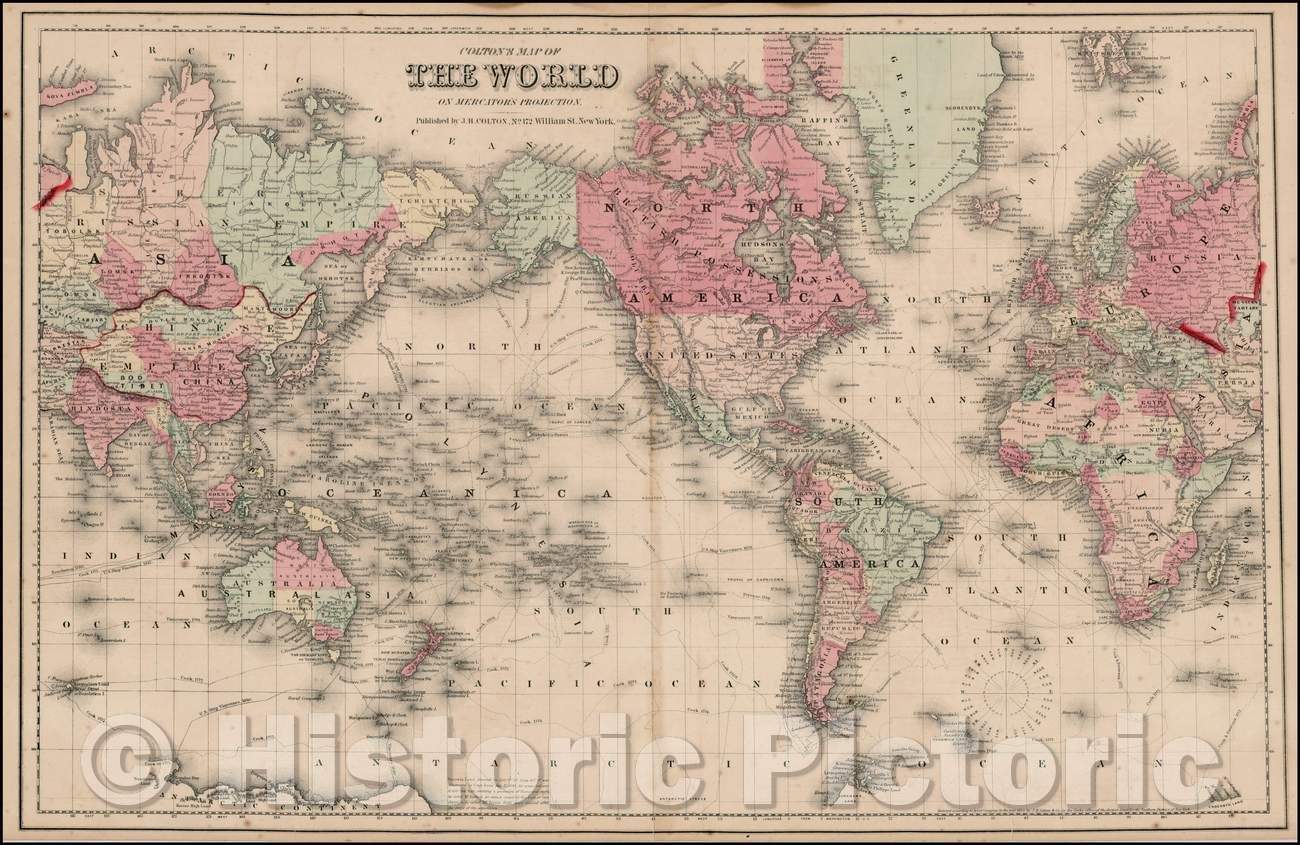 Historic Map - Colton's Map of the World on Mercator's Projection, 1857, Joseph Hutchins Colton - Vintage Wall Art