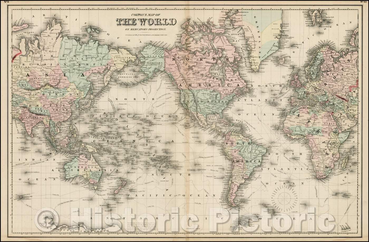 Historic Map - Colton's Map of the World on Mercator's Projection, 1864, G.W. & C.B. Colton - Vintage Wall Art