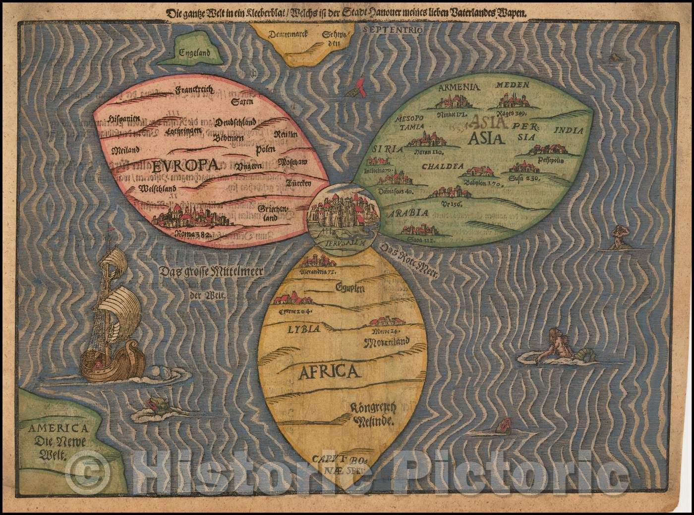 • .Historic Map - Die gantze Welt in einem Kleberblat/Welches ist der Stadt Hannover meines lieben Baterlandes Wapen Clover Leaf World Map, 1581 v4