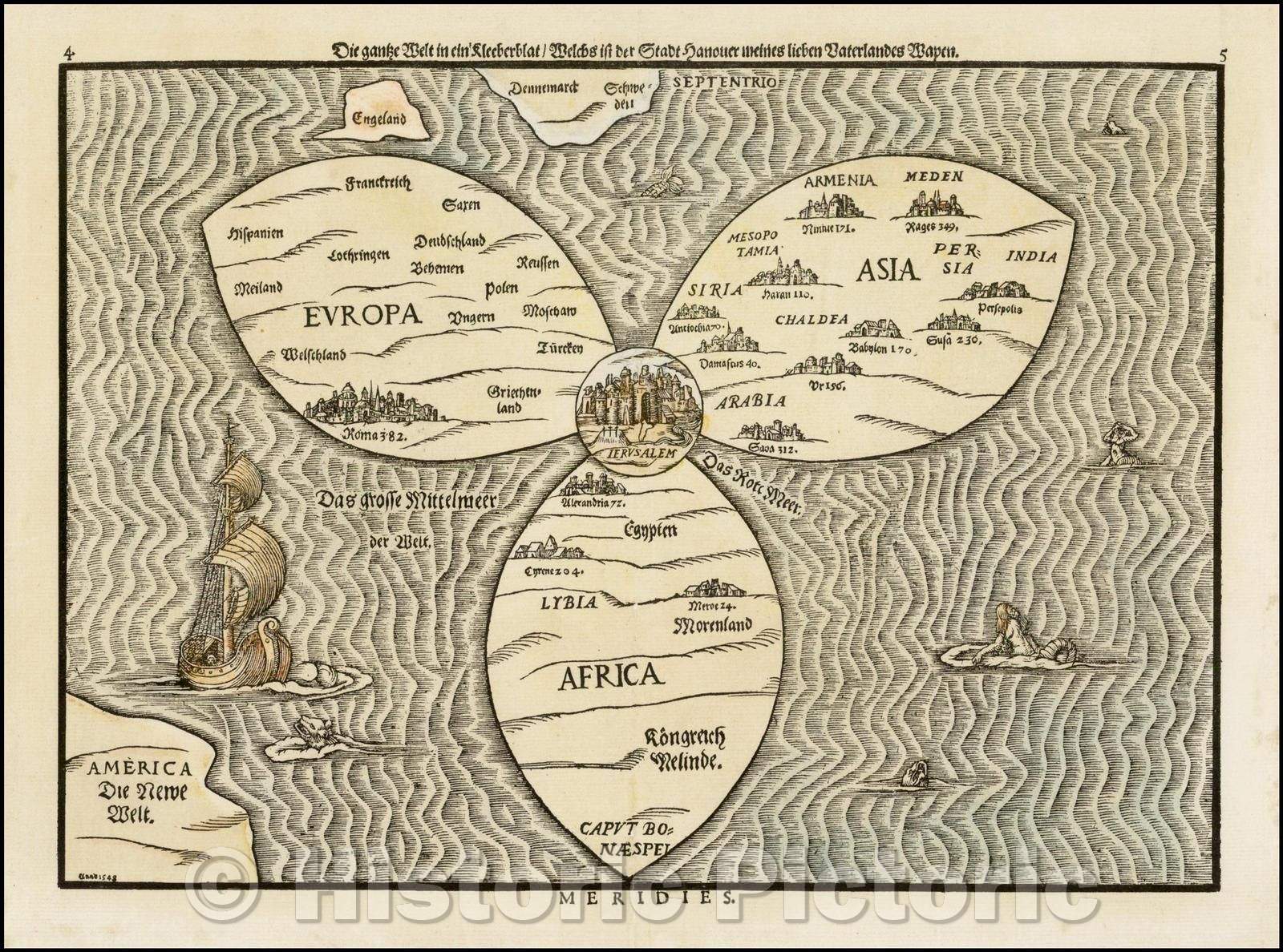 • .Historic Map - Die gantze Welt in einem Kleberblat/Welches ist der Stadt Hannover meines lieben Baterlandes Wapen Clover Leaf World Map, 1581 v2