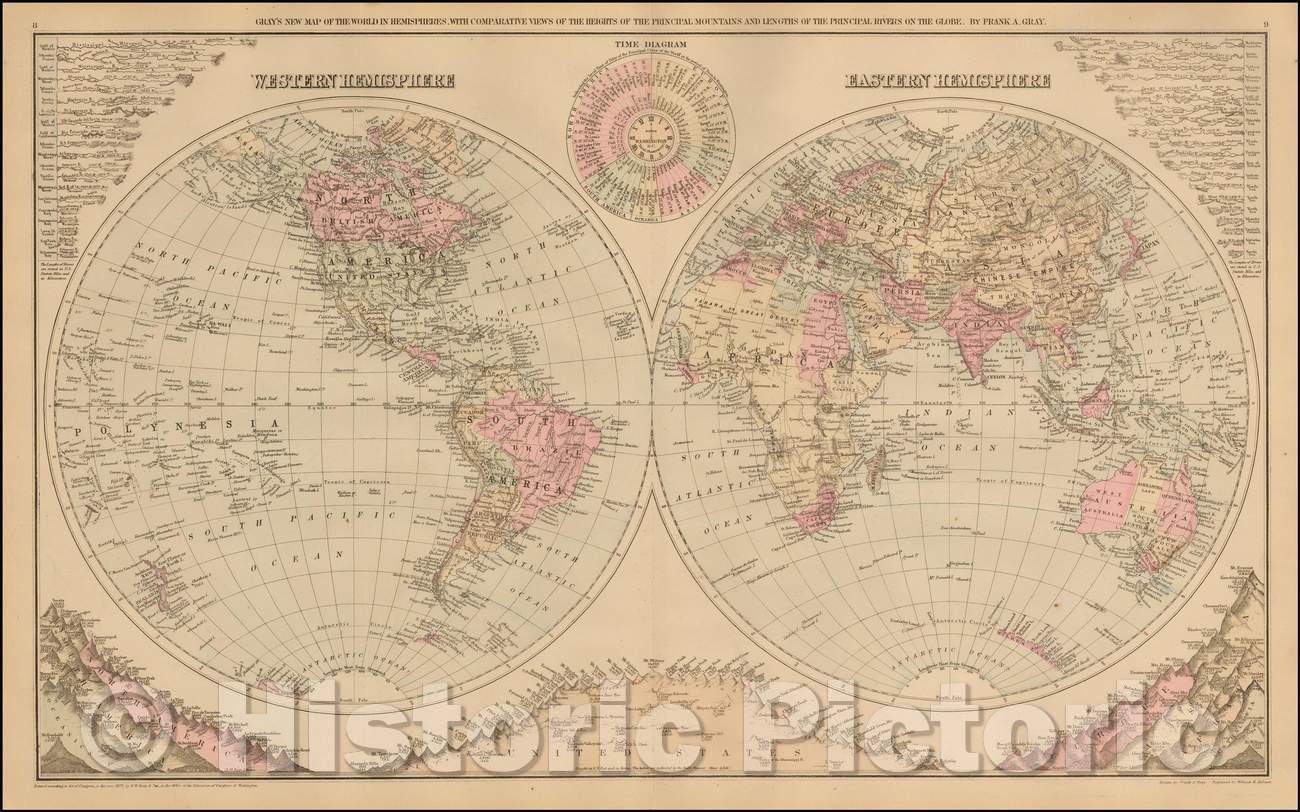 Historic Map - Gray's New Map of the World in Hemispheres, with Comparative Views of the Heights of the Principal Mountains, 1883, O.W. Gray - Vintage Wall Art