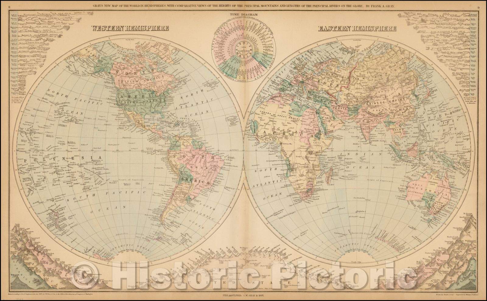 Historic Map - Gray's New Map of the World in Hemispheres, with Comparative Views of the Heights of the Principal Mountains of the World, 1879, O.W. Gray - Vintage Wall Art