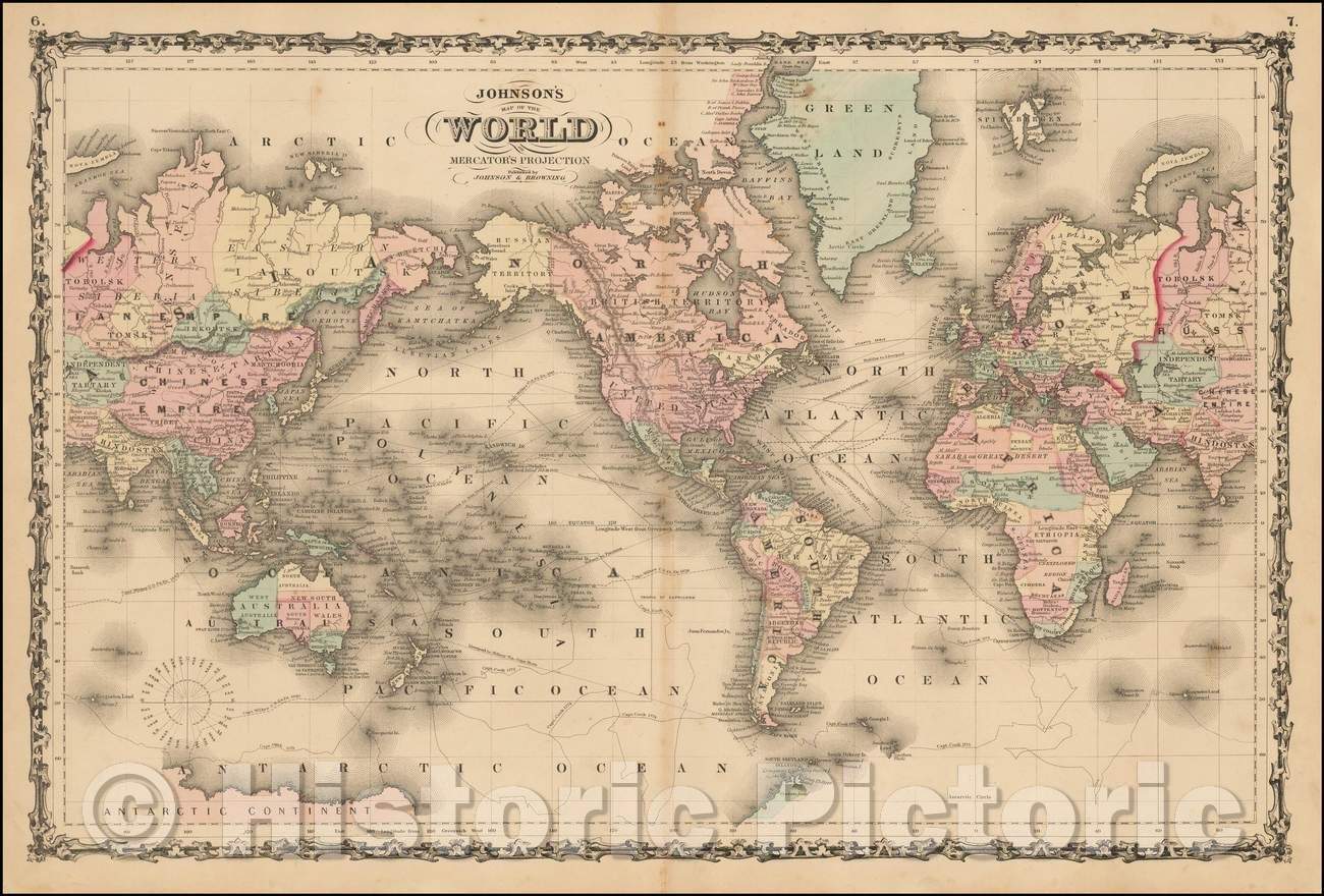 Historic Map - Johnson's Map of the World on Mercator's Projection, 1866, Alvin Jewett Johnson - Vintage Wall Art
