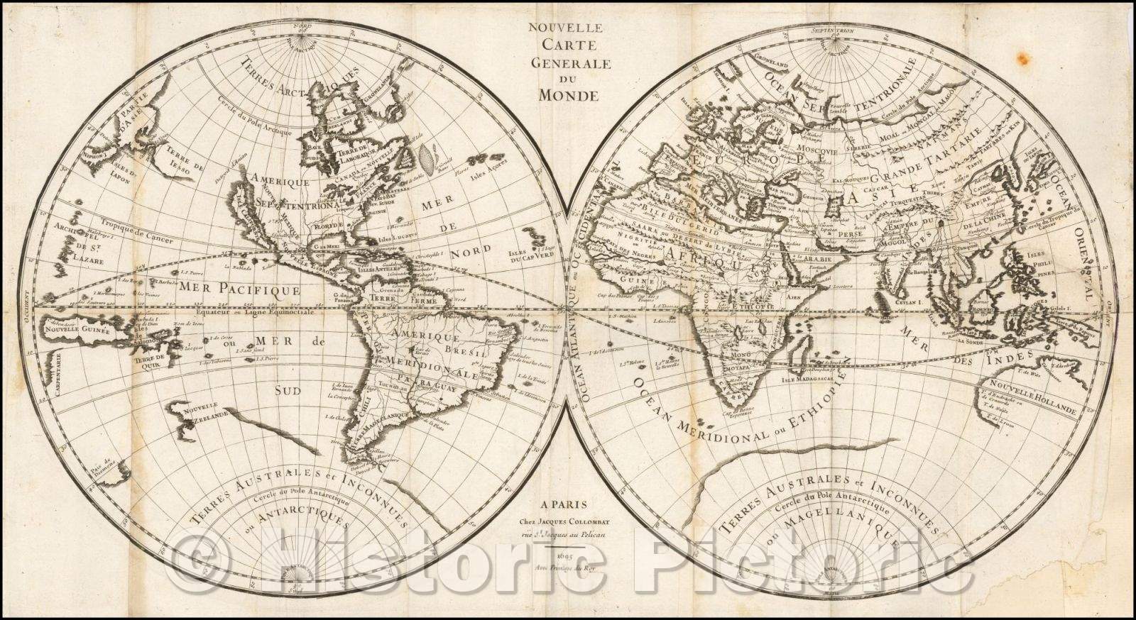 Historic Map - Nouvelle Carte Generale du Monde/French Map of the World by Jacques Collombat, published in Paris in 1695, 1695, Jacques Collombat - Vintage Wall Art
