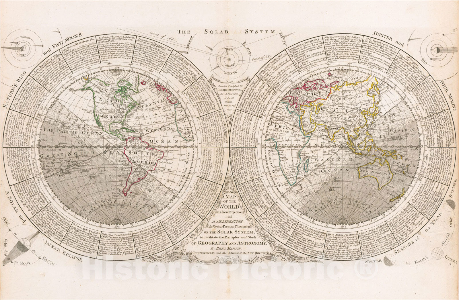 Historic Map : A Map of the World on a new Projection with the Various Parts and Phaenomena of the Solar System, 1794, Benjamin Martin, Vintage Wall Art