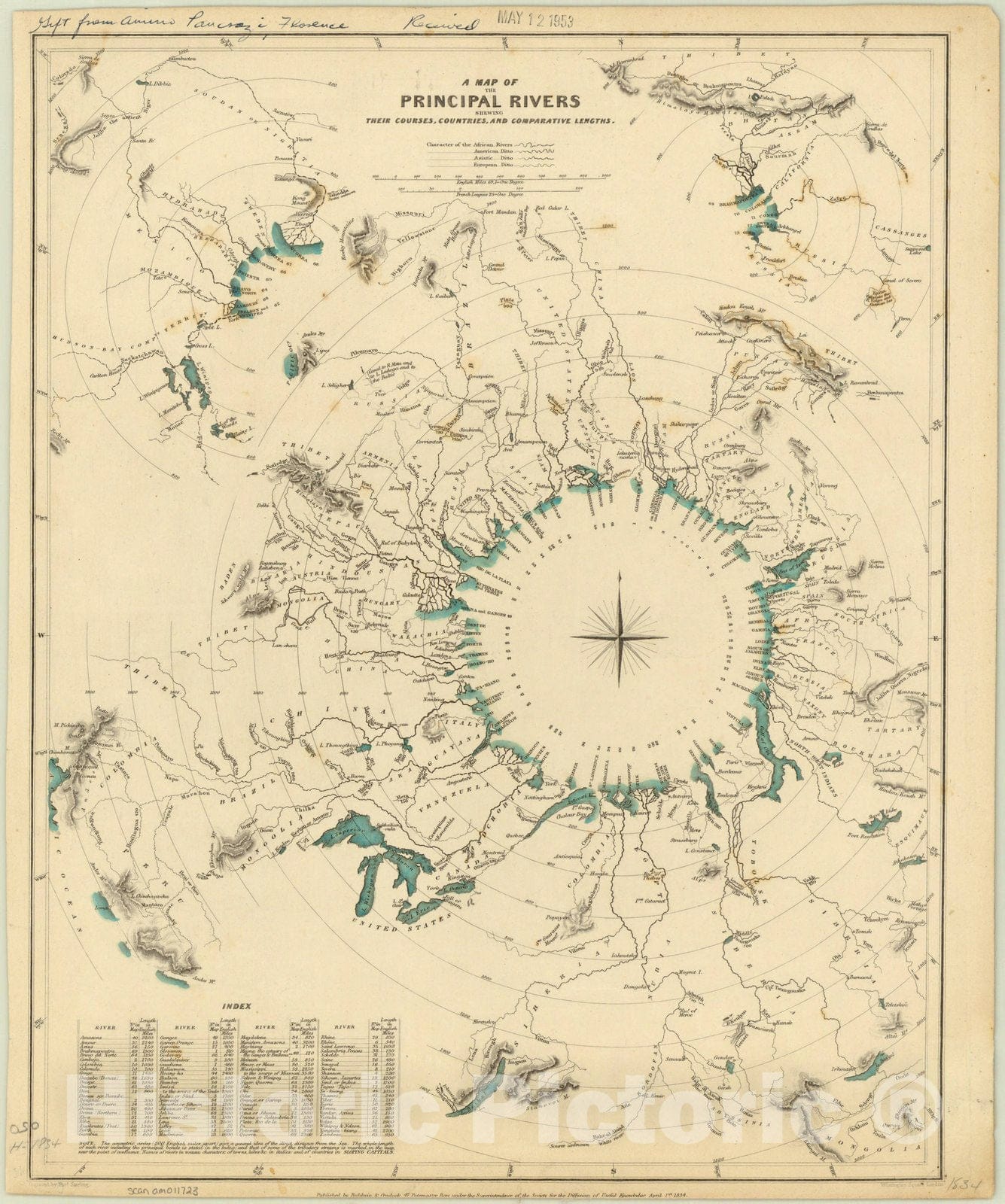 • .Map : World map 1834, A map of the principal rivers shewing their courses, countries, and comparative lengths , Antique Vintage Reproduction