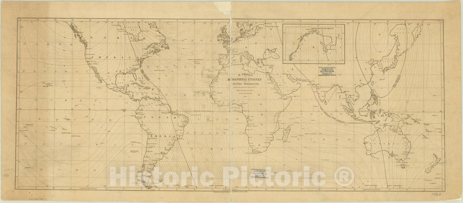 • .Map : World map 1860, Chart of the curves of equal magnetic variation between the Lat. 60N and Lat. 55S from the Admiralty Chart E. & G.W. Blunt 1860