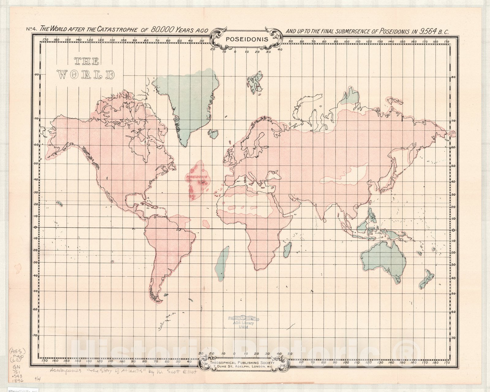 Map : World map 1896, No. 4 The world after the catastrophe of 80,000 years ago and up to the final submergence of Poseidonis in 9,564 B.C., Poseidonis.