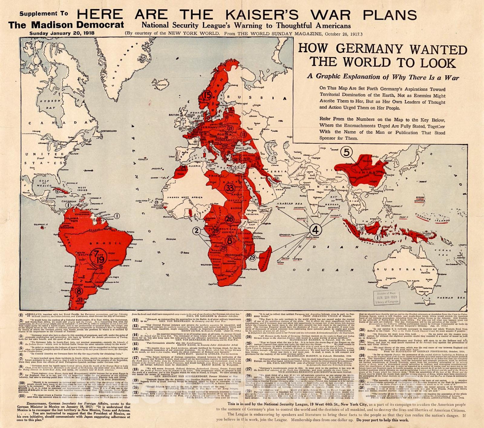 Historic 1917-1918 Map - Here are The Kaiser's war Plans : National Security League's Warning to Thoughtful Americans : How Germany Wanted The World to Look