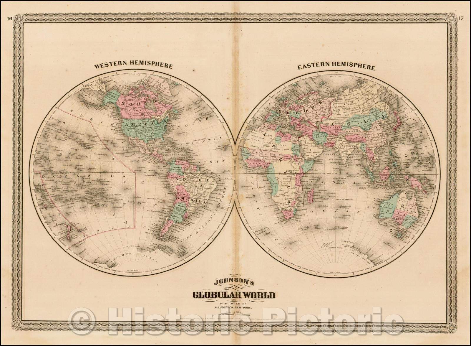 Historic Map - Johnson's Globular World, 1875, Benjamin Ward - Vintage Wall Art