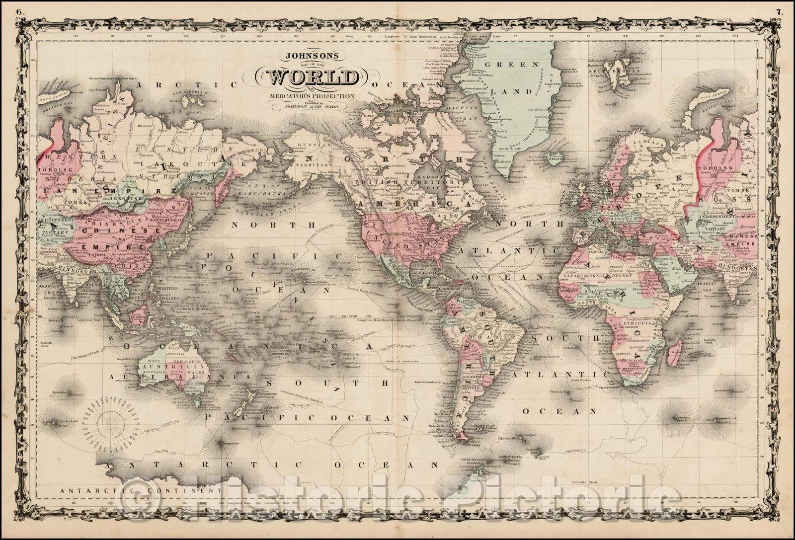 • Historic Map - Johnson's Map of the World on Mercator's Projection, 1862, Benjamin Ward v2