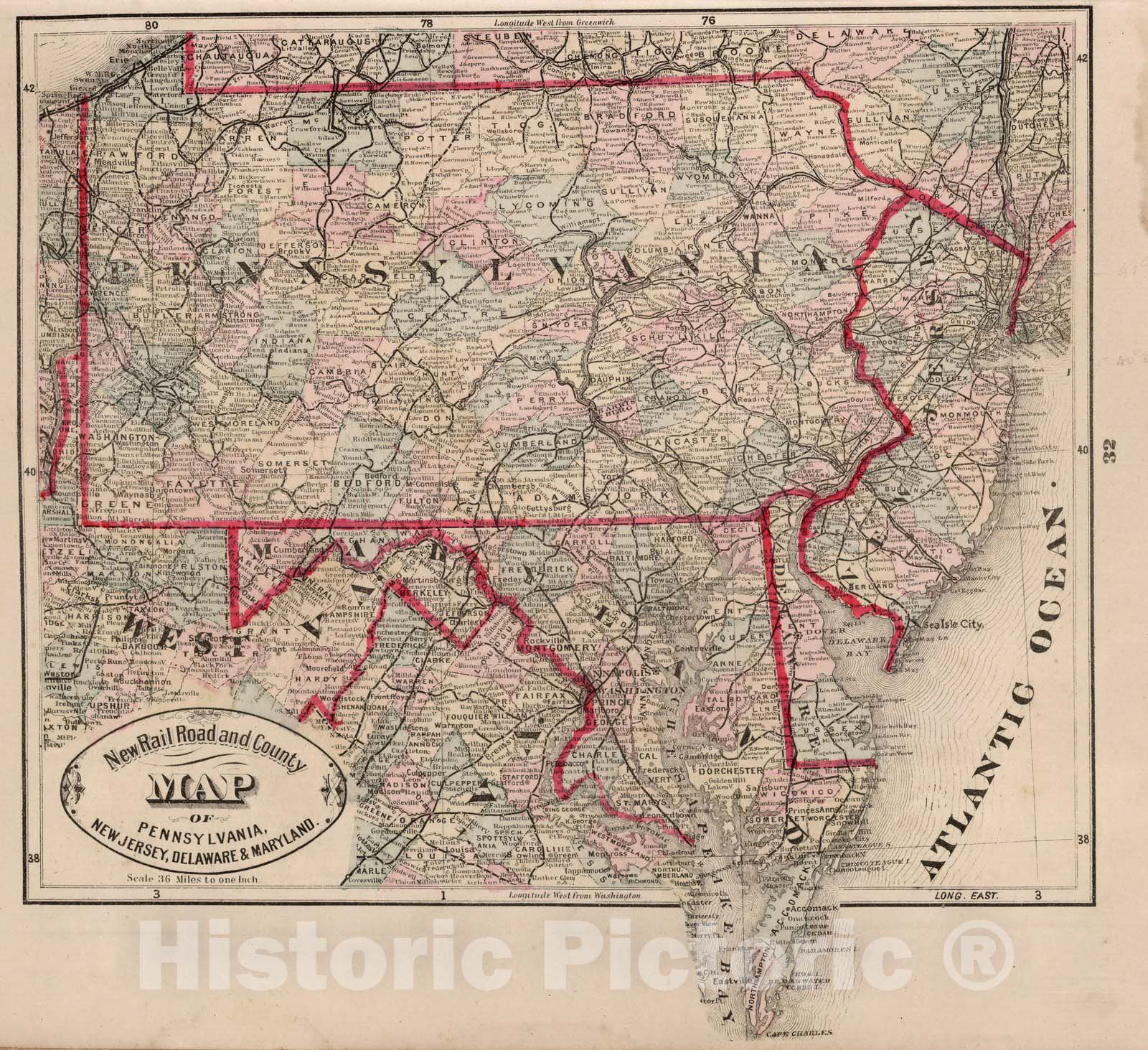 Historic Map : World Atlas Map, Pennsylvania, New Jersey, Delaware & Maryland. 1882 - Vintage Wall Art