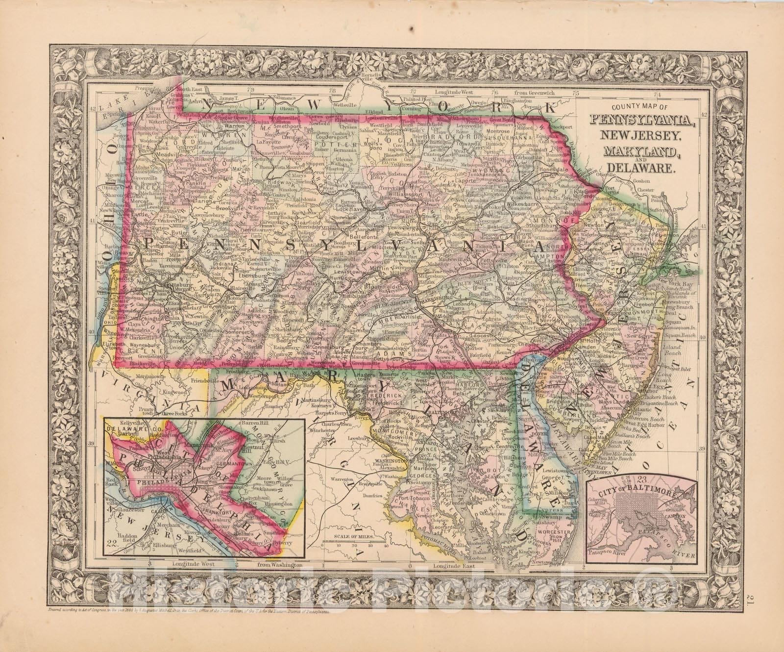 Historic Map : Delaware & Maryland & New Jersey & Pennsylvania 1864 , New General (World) Atlas , Vintage Wall Art
