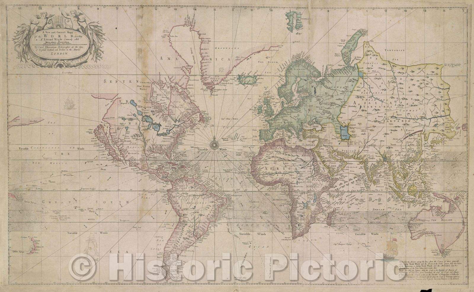 Historic Map : A New and Correct Mapp of the World according to M. r Edward Wright commonly called Mercator's Projection. With a view of the winds and variation, 1708 , Vintage Wall Art