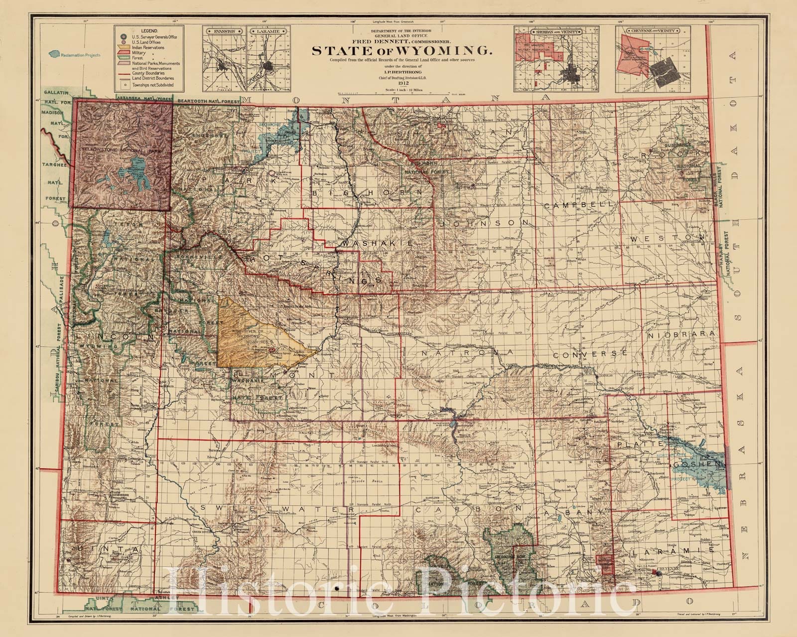 • .Historic Map : Department of The Interior General Land office Map - State of Wyoming, 1907 1907 - Vintage Wall Art