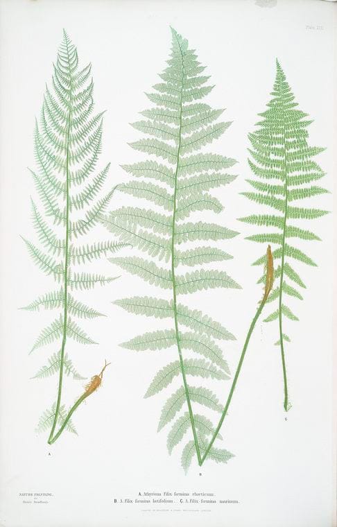 Art Print : A. Athyrium Filix-foemina crispum. B. Athyrium Filix-foemina depaperatum. C. Athyrium Filix-foemina dissectum. [The Lady Fern], 1831 - Vintage Wall Art
