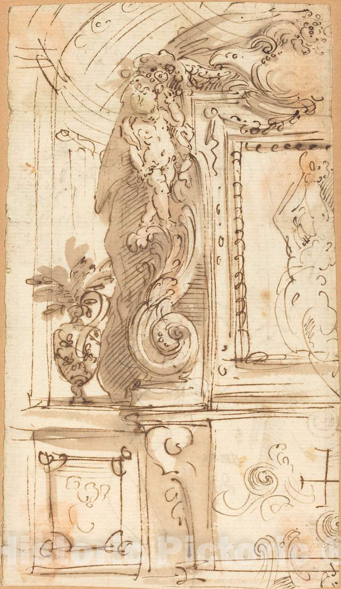 Artist: Genoese 17th Century | Drawing: An Elaborately Sculpted Frame | Original Medium: pen and brown ink with gray and red-brown wash on laid paper