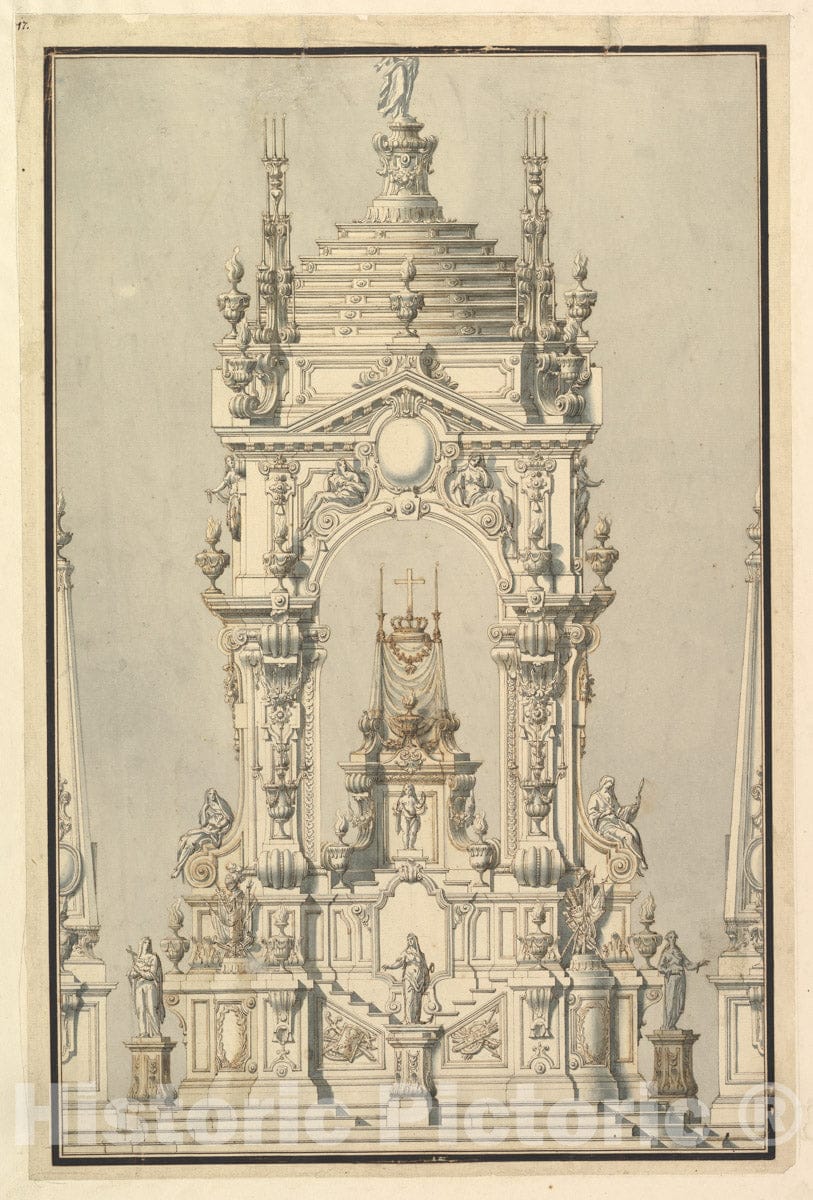 Art Print : Elevation of a Catafalque with Royal Crown and Order of The Golden Fleece - Artist: Giuseppe Galli Bibiena - Created: c1729 : Vintage Wall Art