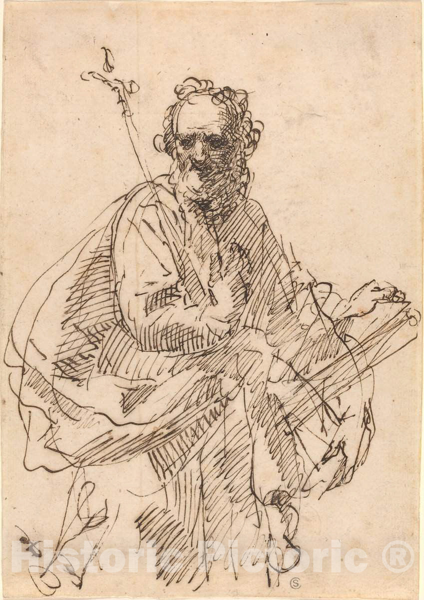 Artist: Francisco Herrera II | Drawing: A Standing Saint with a Crucifix and a Book | Original Medium: pen and iron gall ink on laid paper