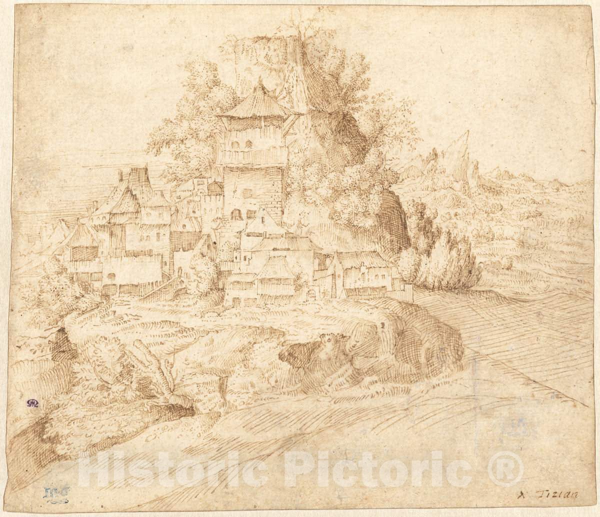 Art Print : Giulio Campagnola, A Village by a Cliff (Recto), c. 1513 - Vintage Wall Art