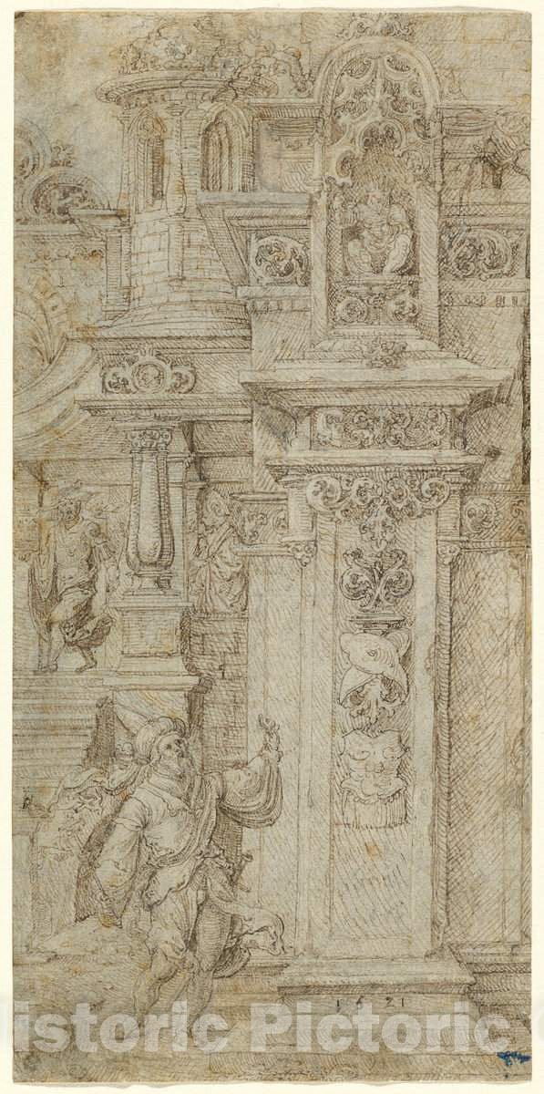 Artist: Jan Gossaert | Drawing: Two Kings and a Woman Leaving an Elaborate Palace | Original Medium: pen and black ink on laid paper