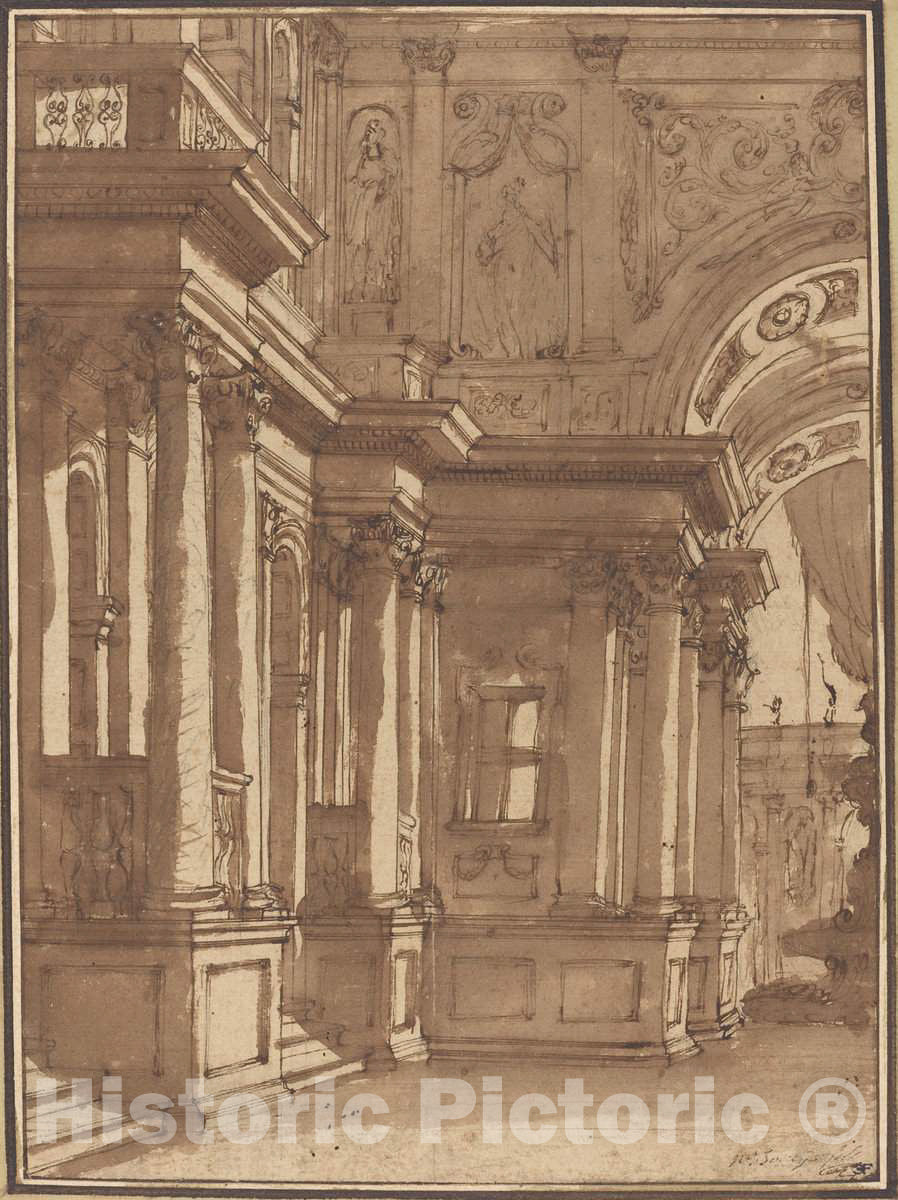 Artist: Juste-Franois Boucher | Drawing: Interior of a Palace | Original Medium: pen and brown ink with brown wash over graphite on laid paper; laid down