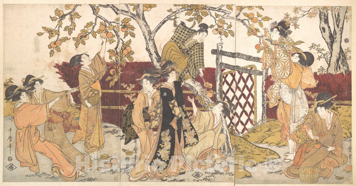 Picking Persimmons (Kaki-mogi) - Japanese, ca. 1754-1806 - Artist Nationality: Japanese - Original Medium, Materials or Technique: Triptych of polychrome woodblock prints; ink and color on paper