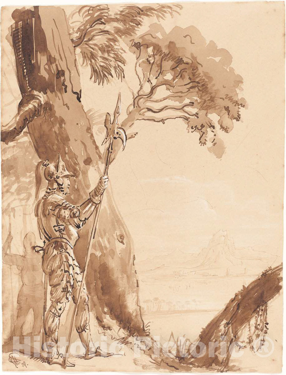 Artist: Sir George Hayter | Drawing: Bandits on the Lookout | Original Medium: pen and brown ink with brown wash, heightened with white, on brown wove paper