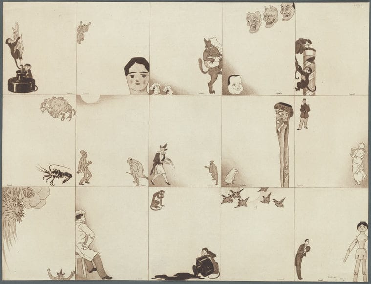 Art Print : Two Monkeys Playing with an Inkwell; an Asian Man and a Doll's Head; Two Chefs and a cat Playing Guitar,c1880 - Vintage Wall Art