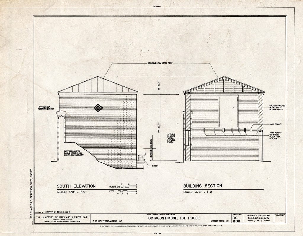 Blueprint South Elevation & Section - Octagon House, Ice House, 1799 New York Avenue, Northwest, Washington, District of Columbia, DC