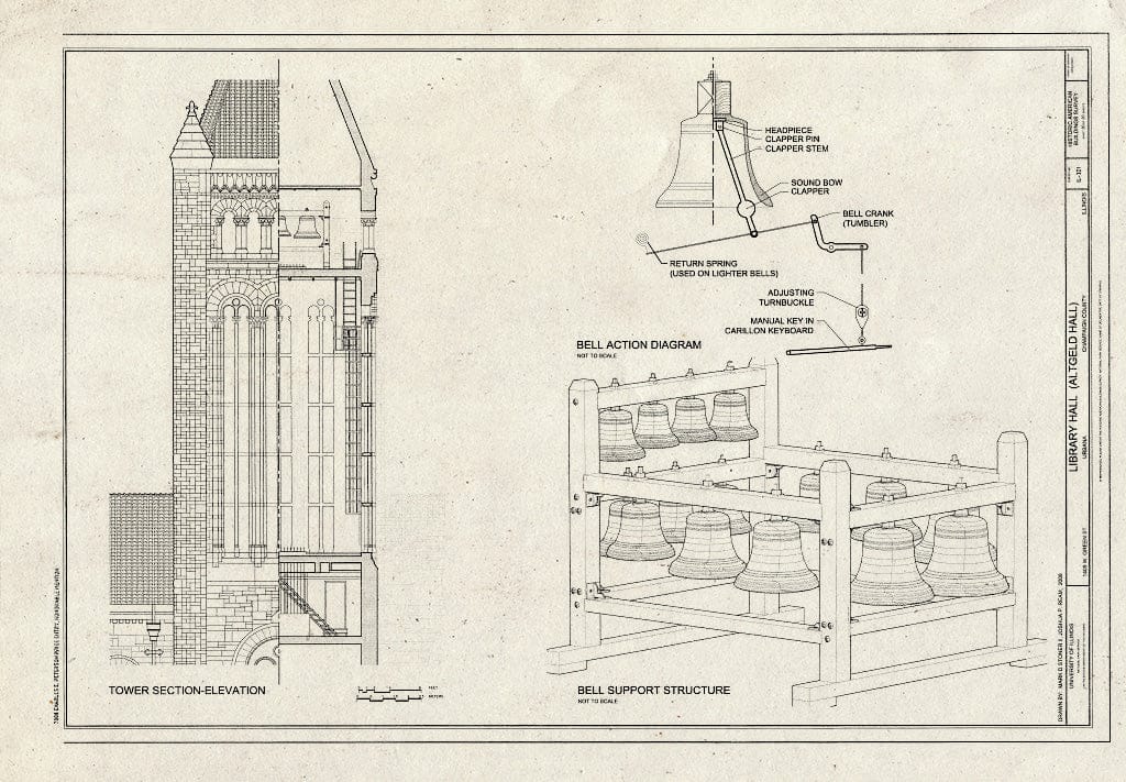 Blueprint Tower Section-Elevation, and Bell Support Structure and Action Diagram - Library Hall, 1409 West Green Street, Urbana, Champaign County, IL