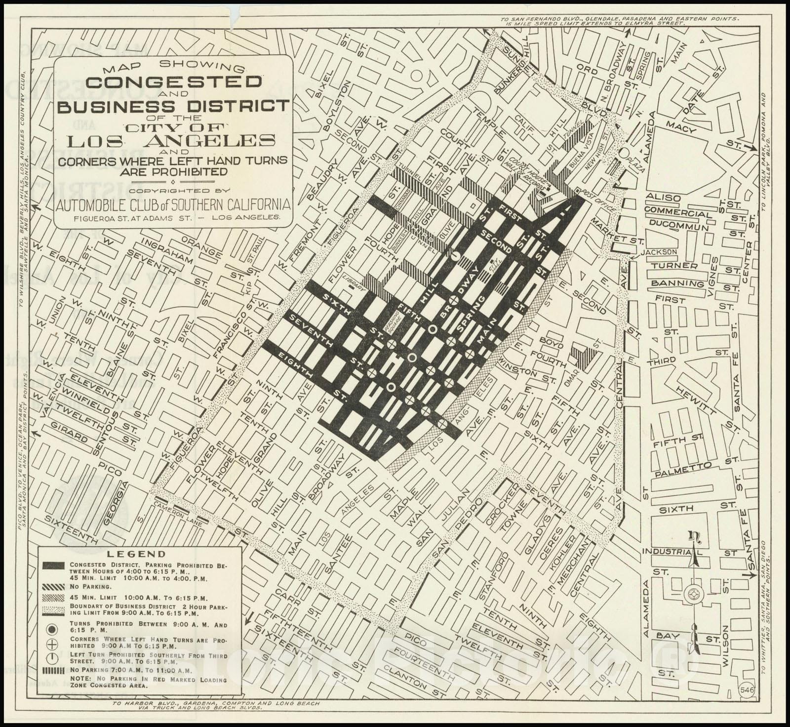 Historic Map : Congested and Business District of the City of Los Angeles and Corners Where Left Hand Turns Are Prohibited, 1920, Vintage Wall Art