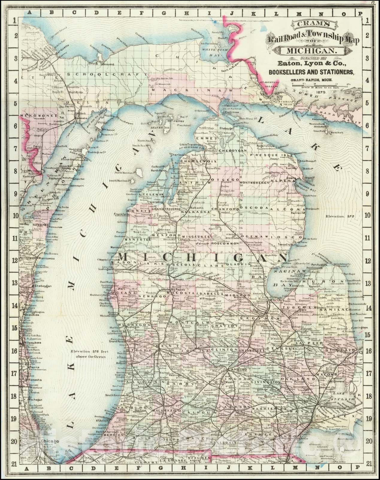 Historic Map : Cram's Rail Road & Township Michigan. Published By Geo. F. Cram Proprietor of the Western Map Depot, 1879, 1879, Vintage Wall Art