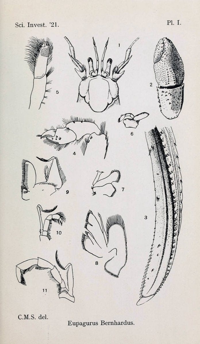 Decapoda reptantia of the coasts of Ireland. London,1914-21. |"Decapoda (Crustacea)" |taxonomy:binomial=Pagurus bernhardus |
