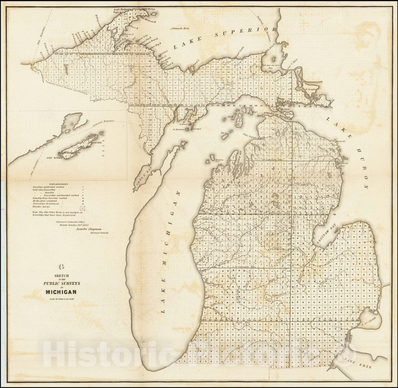 Historic Map : G Sketch of the Public Surveys in Michigan, 1853, Vintage Wall Art