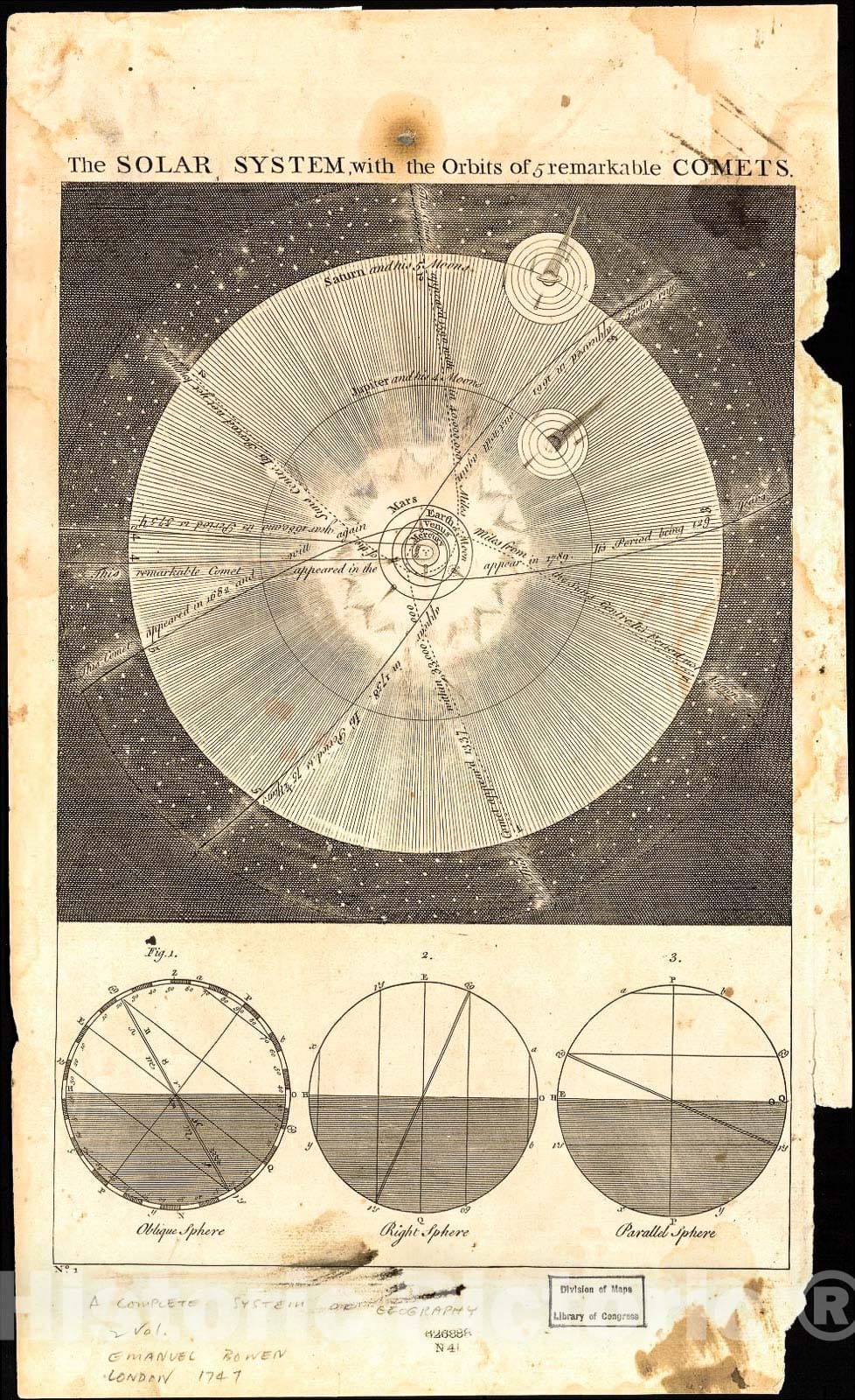 Historic 1747 Map - The Solar System, with The orbits of 5 Remarkable Comets.