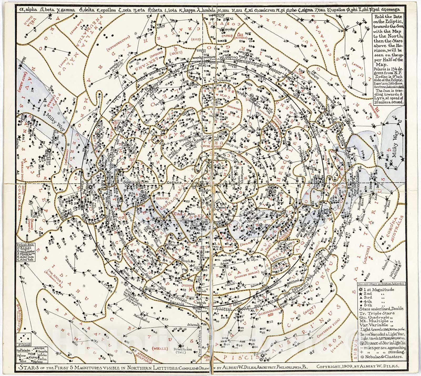 Historic 1909 Map - Stars of The First 5 magnitudes Visible in Northern latitudes 1