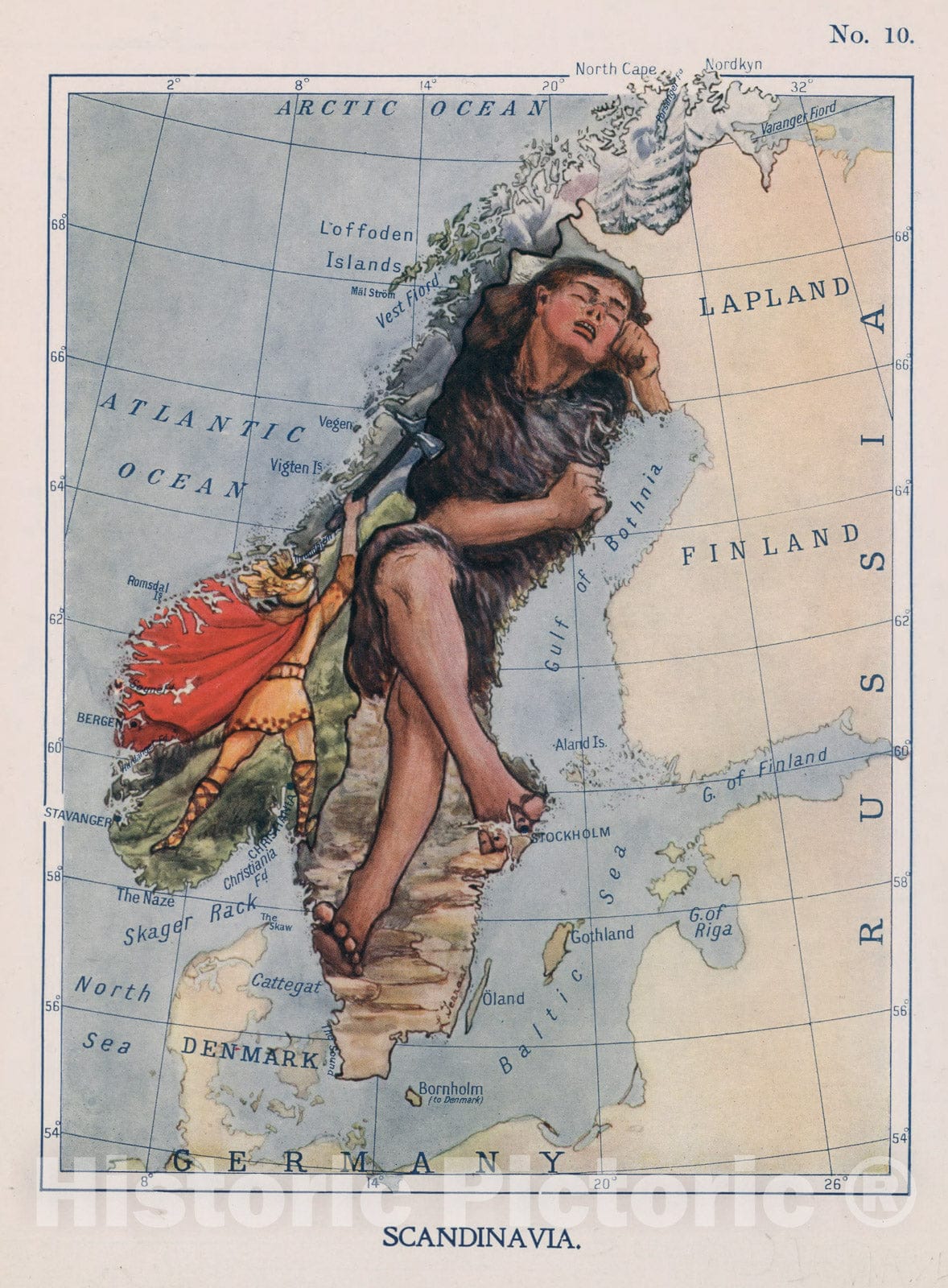 Historic Map : 10. Scandinavia. Thor Hurls his Hammer at the Sleeping Giant., 1912, Vintage Wall Decor