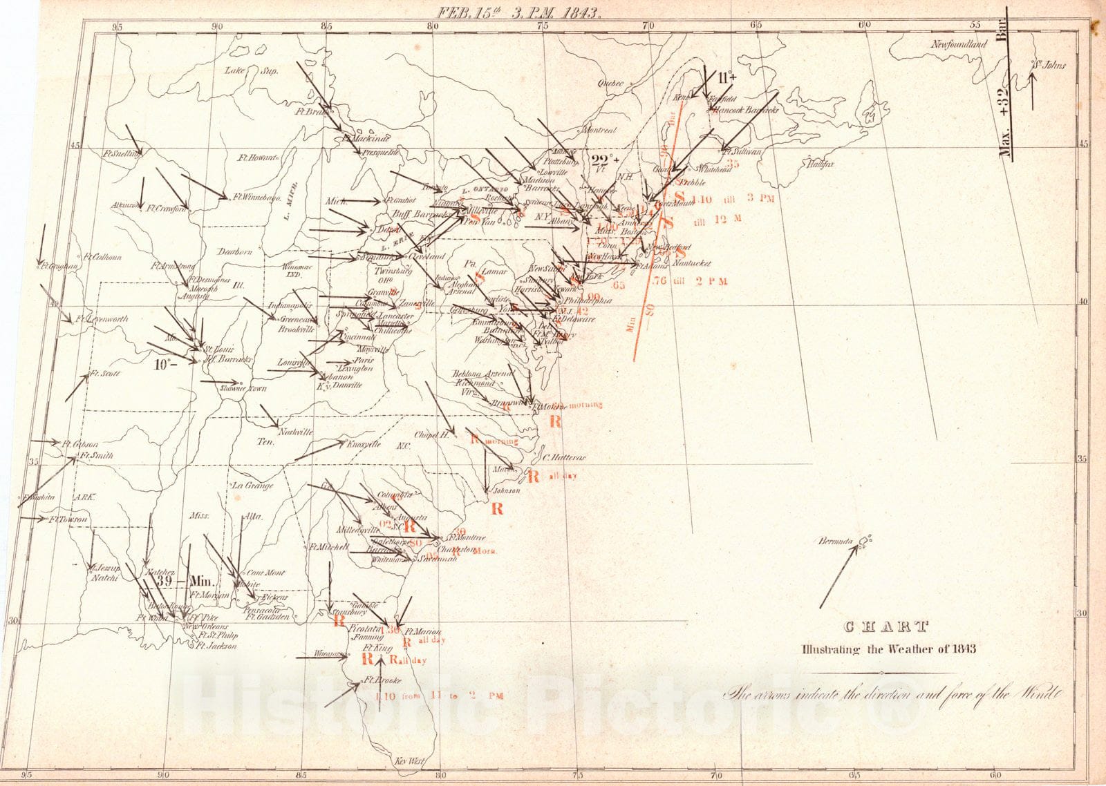Historic Map : 1843 Chart Illustrating the Weather of the 1843 (The arrows indicate the direction and force of the Wind) : Vintage Wall Art