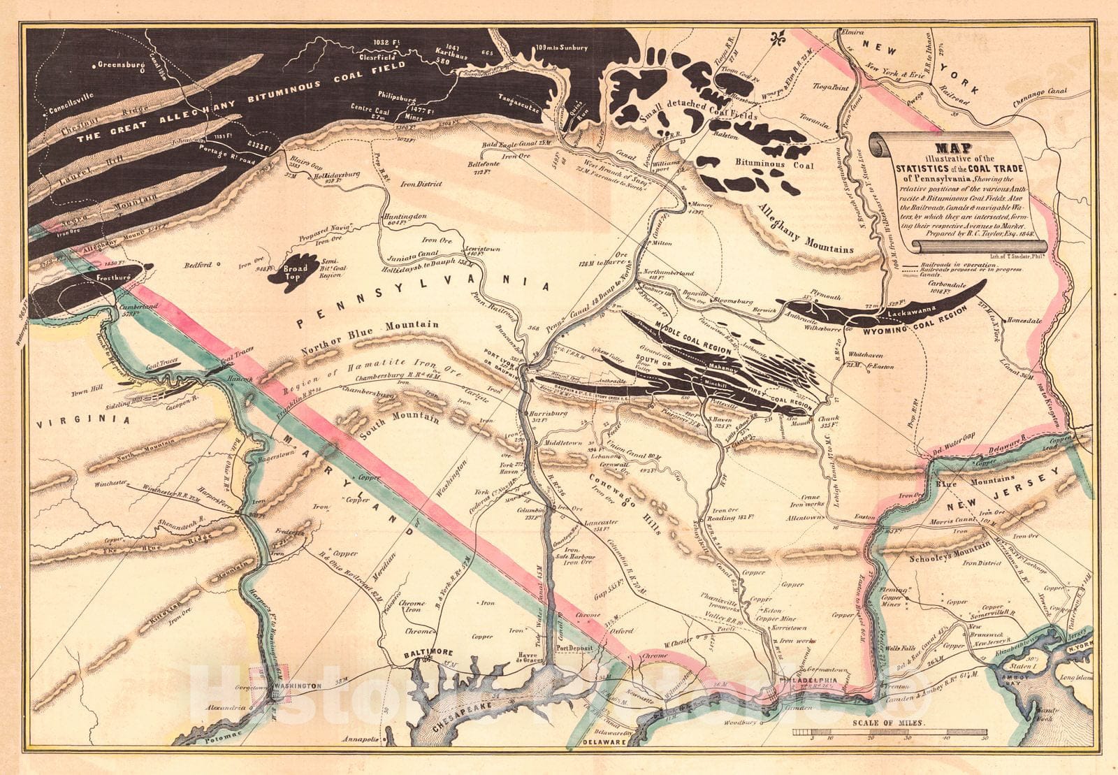 Vintage Map | 1848 Map Illustrative of the Statistics of the Coal Trade of Pennsylvania | Taylor, R.C.
