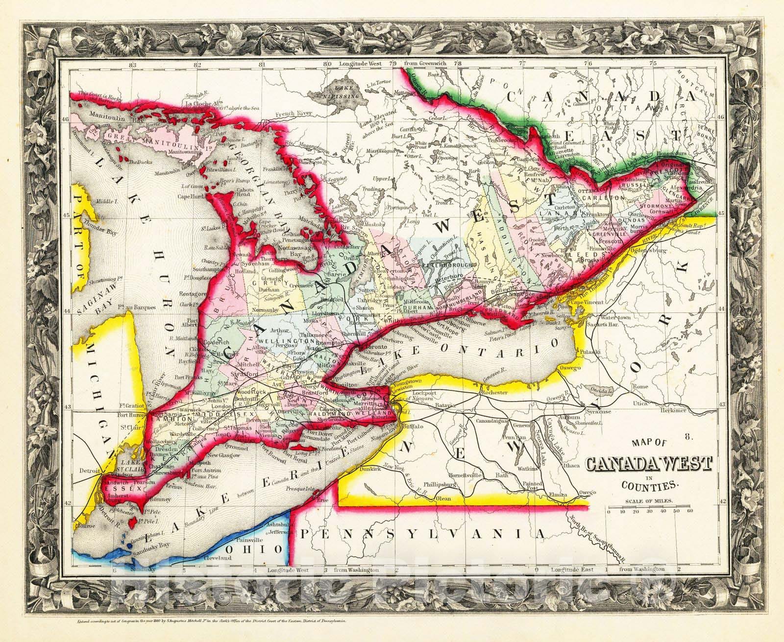 Vintage Map | 1860 Map of Canada West in Counties | Mitchell, S. Augustus Jr.