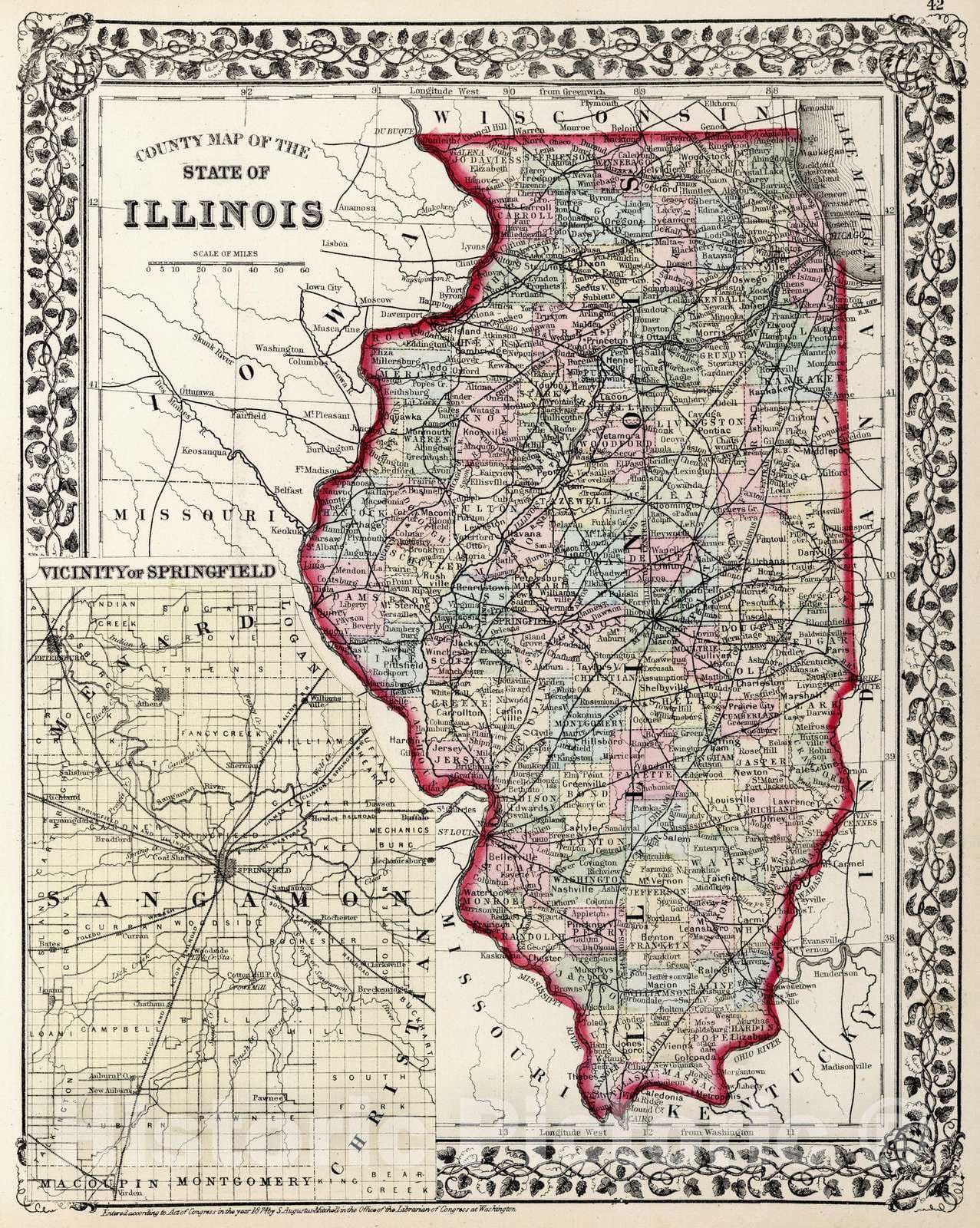 Historic Map : 1874 County map of the State of Illinois - Vintage Wall Art