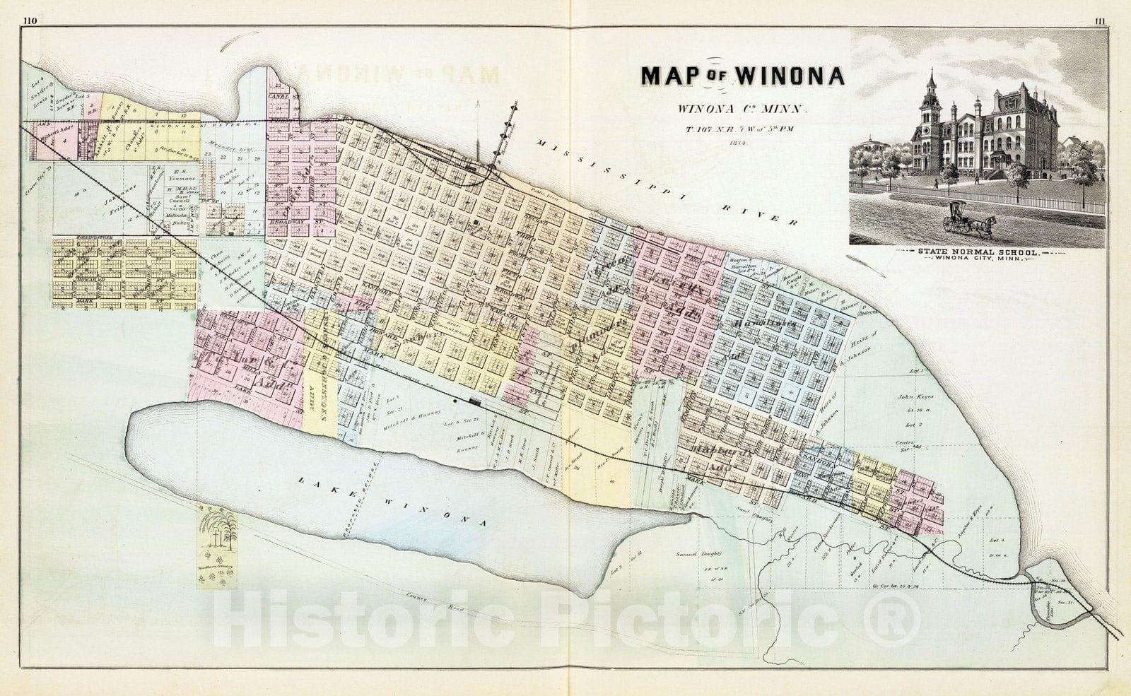 1874 Map of Winona, Minn, with view of State Normal School.